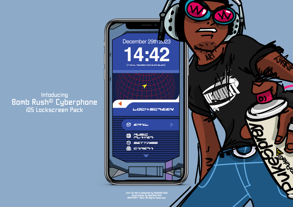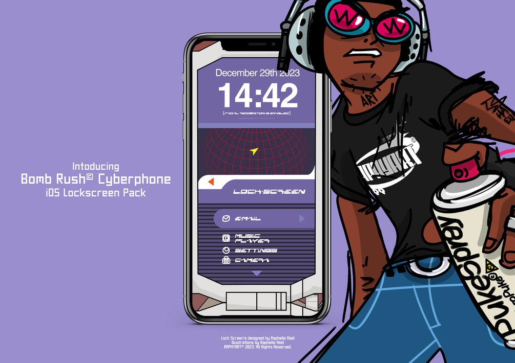 In anticipation for the release of S2Y2K, RAPHYART© and HeroPuke© have designed a collection of lockscreens Inspired by the Team Reptile's 2023 game Bomb Rush Cyberfunk, This pack comes with two colourways- One based on the original design as seen in game and a second darker design for dark mode users.