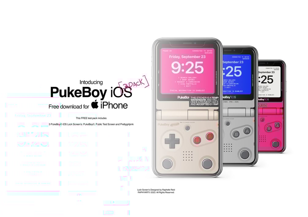 The PukeBoy© iOS Lock Screen Pack is a collection of wallpapers inspired by the original Gameboy released in 1989 in Japan and then a year later in 1990 for the West. In anticipation for the release of S2Y2K, RAPHYART© and HeroPuke© have designed a collection of lockscreens and watch faces to follow the drop planned for a potential November release.